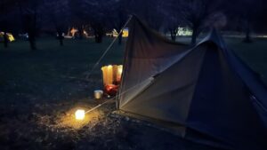 「弱」や「中」でも、同様のスペックの他のランタンよりも明るく見えるので、手元を照らすくらいなら十分です。↓テント内の前室で「弱」で使用。